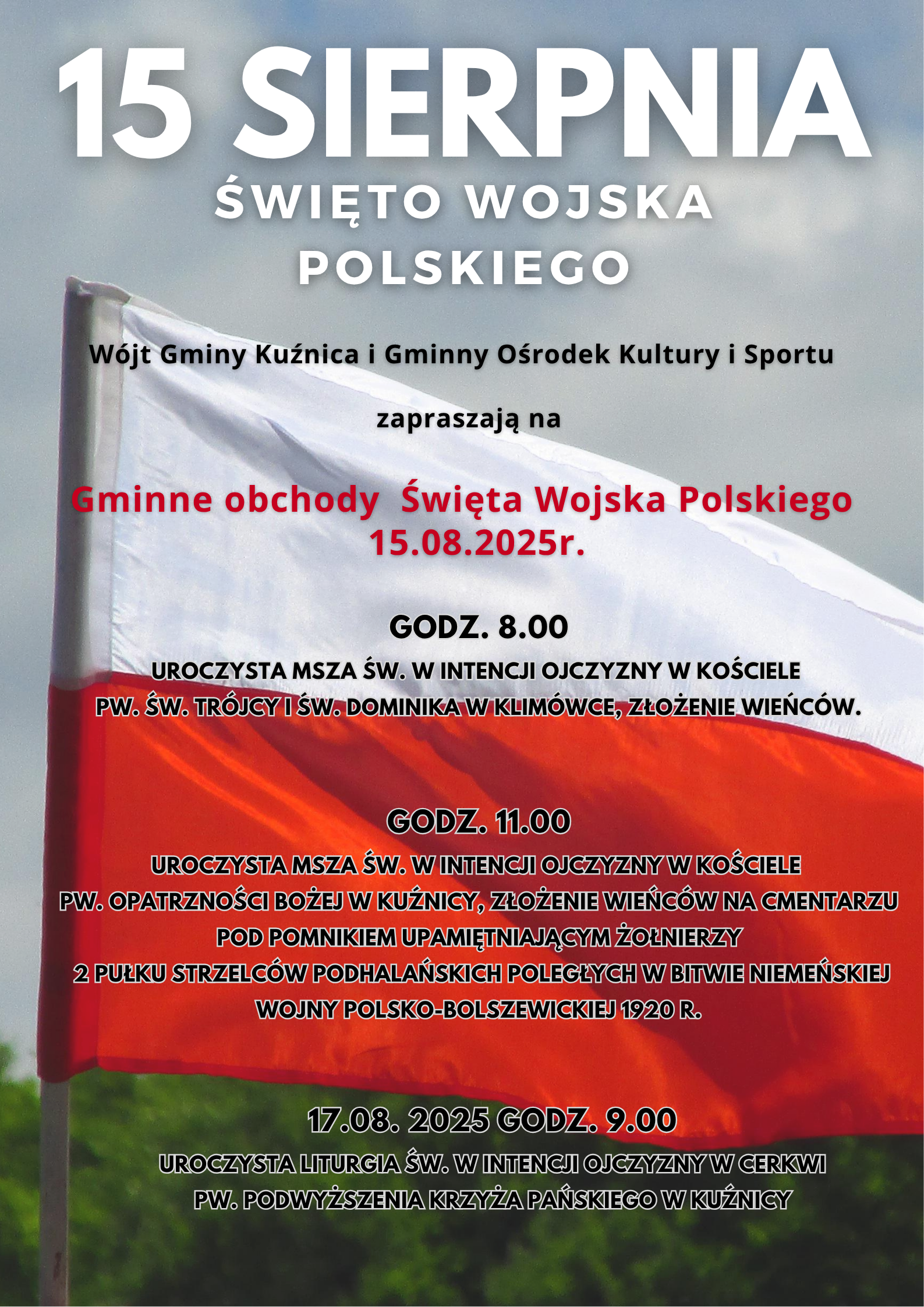 Wójt Gminy Kuźnica oraz Gminny Ośrodek Kultury i Sportu w Kuźnicy zapraszają na Gminne obchody Święta Wojska Polskiego.