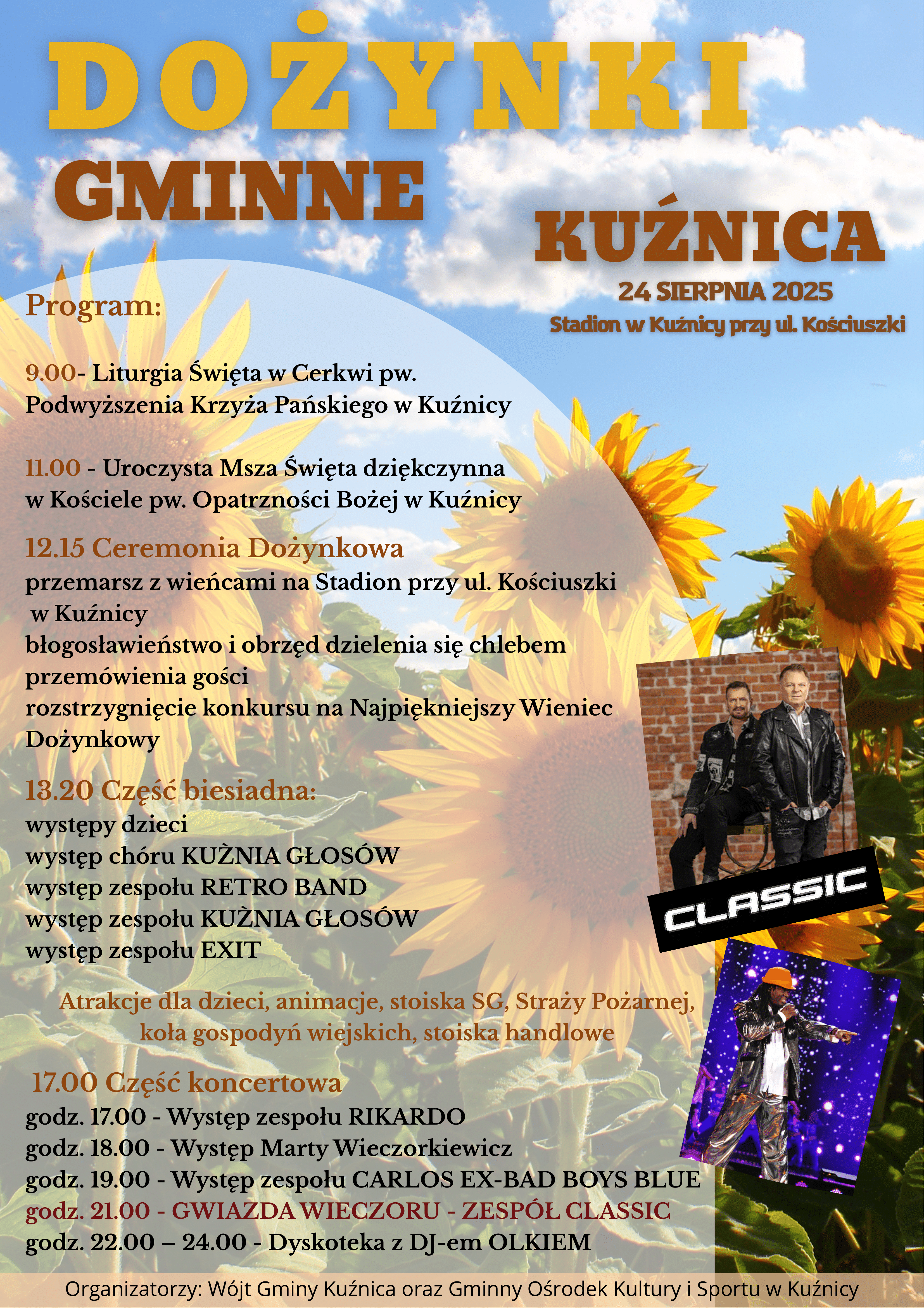 Wójt Gminy Kuźnica i Gminny Ośrodek Kultury i Sportu w Kuźnicy zapraszają na Dożynki Gminne w Kuźnicy w dniu 24 sierpnia 2025 r.