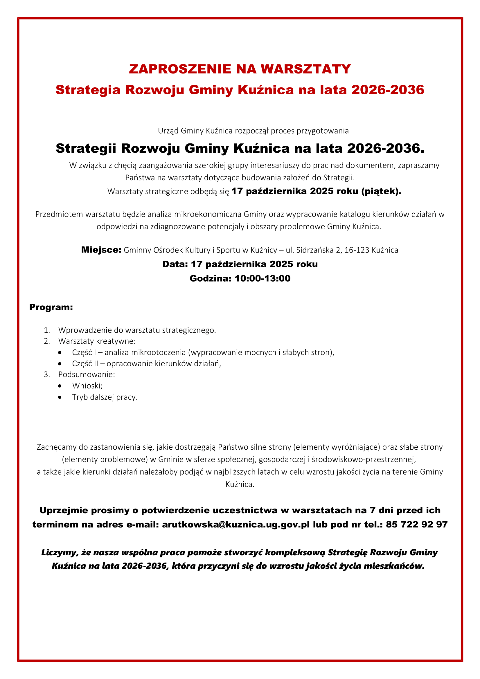 Prosimy o potwierdzenie uczestnictwa do dnia 10 października 2025 r. na adres e-mail: arutkowska@kuznica.ug.gov.pl lub telefonicznie pod numerem: 85 722 92 97.