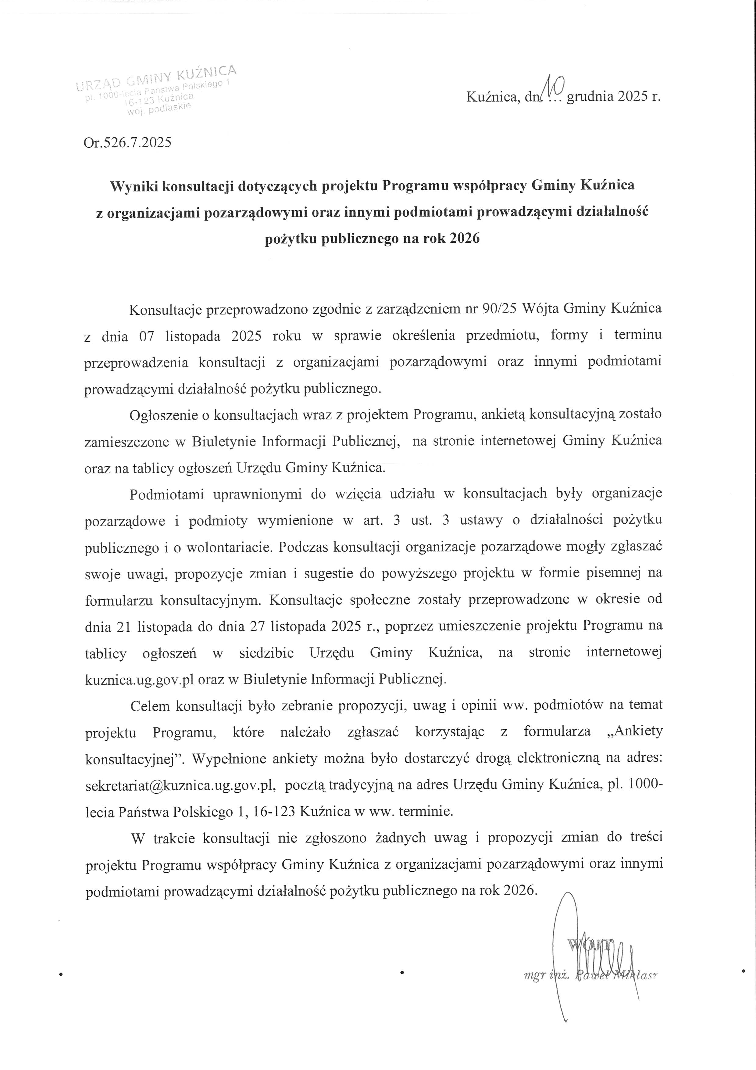 Wyniki konsultacji dotyczących projektu Programu współpracy Gminy Kuźnica 2026Archiwum