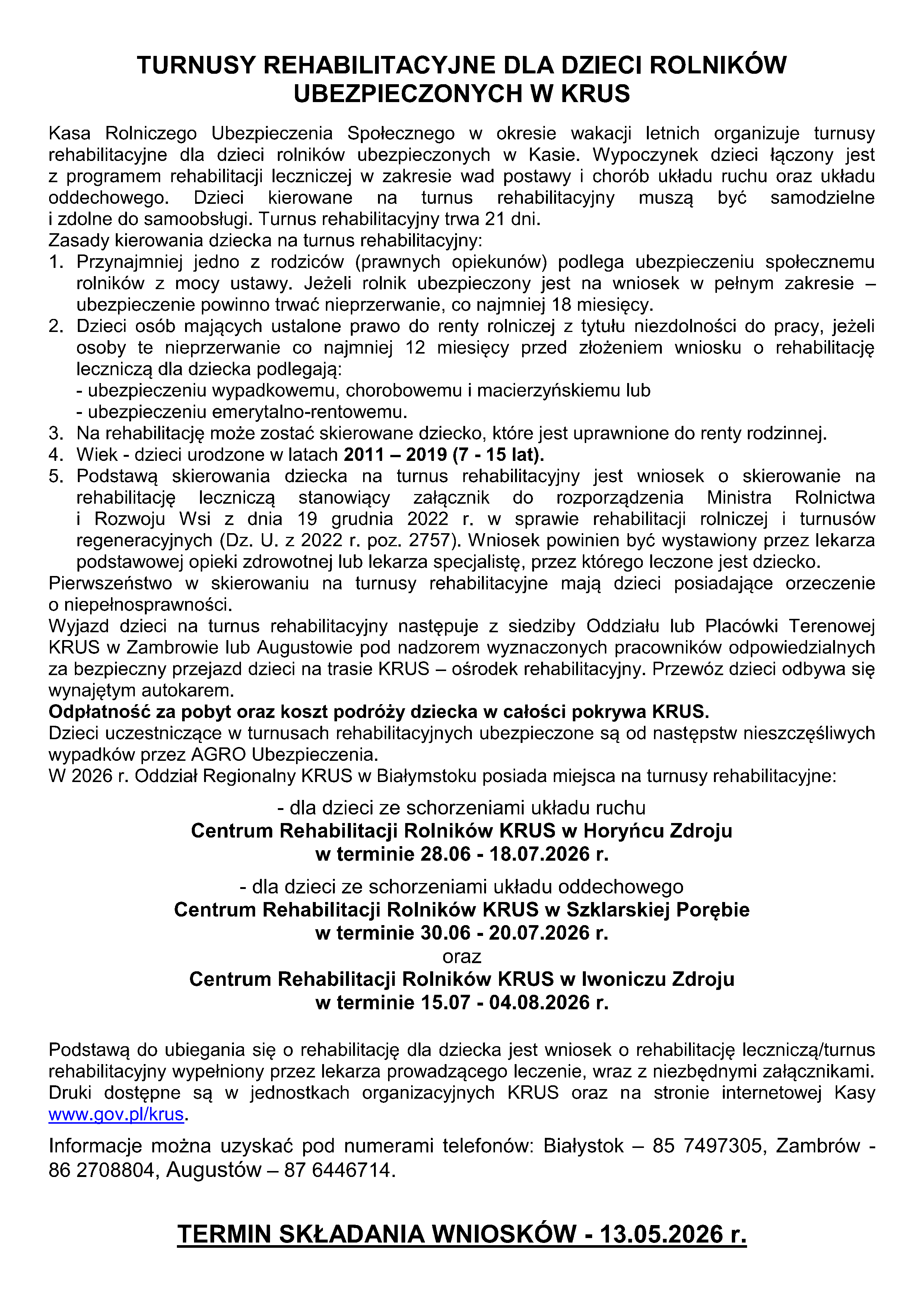 TURNUSY REHABILITACYJNE DLA DZIECI ROLNIKÓW UBEZPIECZONYCH W KRUS